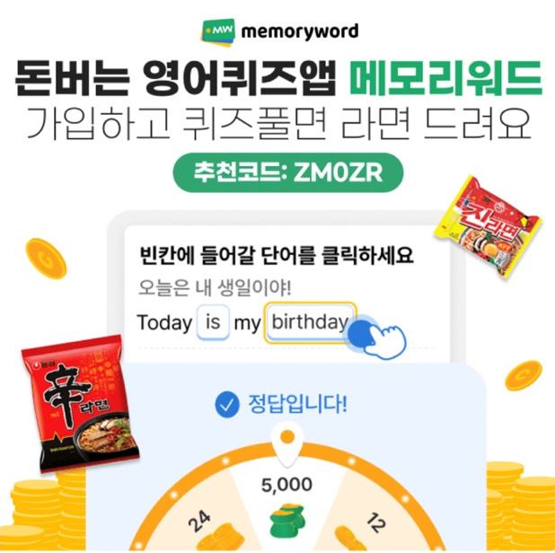 돈버는 영어퀴즈앱 메모리워드 가입하고 퀴즈풀면 라면 드려요 추천코드 ZM0ZR