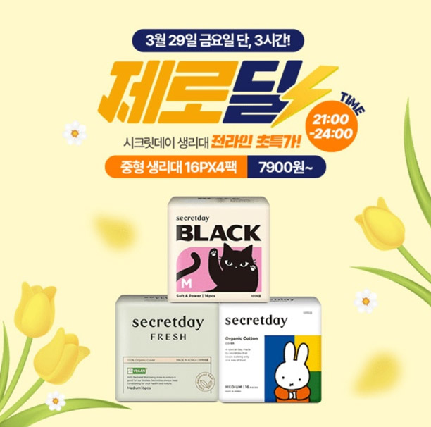 3시간 동안 진행되는 "캐시딜" 타임특가에서 시크릿데이 전품목 생리대 4팩 (중형/대형/소형/일반라이너/롱라이너/입는 오버나이트)이 역대급할인 7900원 + 무료배송에 진행됩니다