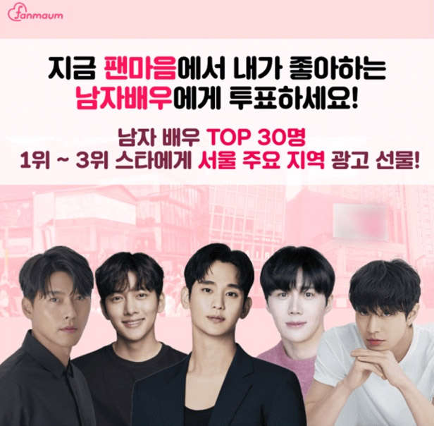 지금 팬마음에서 내가 좋아하는 남자배우에게 투표하세요! 남자 배우 TOP 30명 1위 ~ 3위 스타에게 서울 주요 지역 광고 선물!